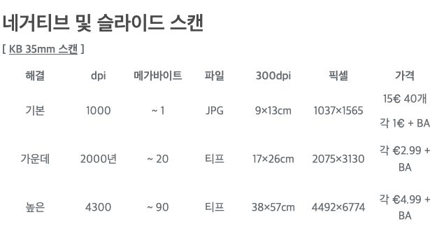 독일은 아래의 표준가격에 BA라는 가격을 추가로 받습니다. BA의 뜻은 편집이며 약 4유로입니다. 그래서 가장 저렴한 화질 기준으로는 스캔 1 롤에 5유로 정도 되게 됩니다. 그리고 이메일로 전송받는데 1유로를 더 내야 합니다. 독일에서는 이렇게 디지털로 서비스를 받는 것이 '프리미엄'서비스 이기 때문입니다.