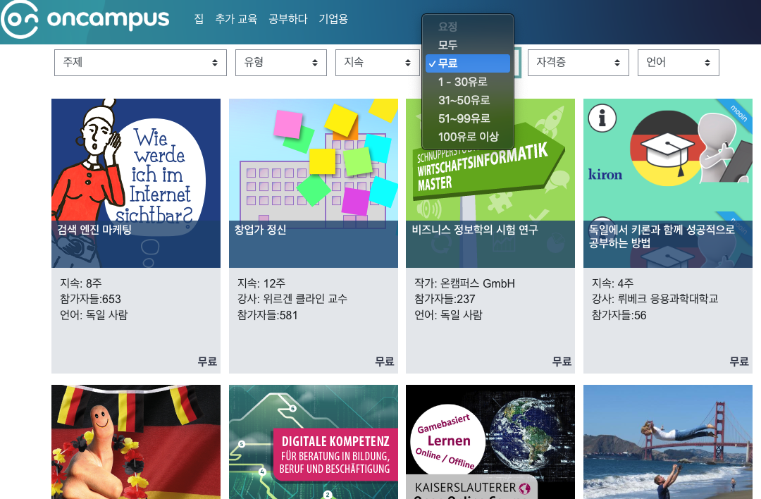 무료 과정과 유료과정이 섞여있으니 아래와 같이 필터를 적용하셔야 합니다.