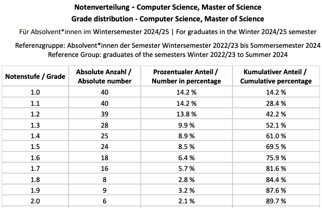 아직 학업에 재학 중인 경우 ECTS 순위 또는 비교 가능한 성적 경계를 생성할 수 없습니다. 따라서 잠정 평균 성적을 분류할 때는 가장 최근에 나온 ECTS 순위를 사용해 주세요.